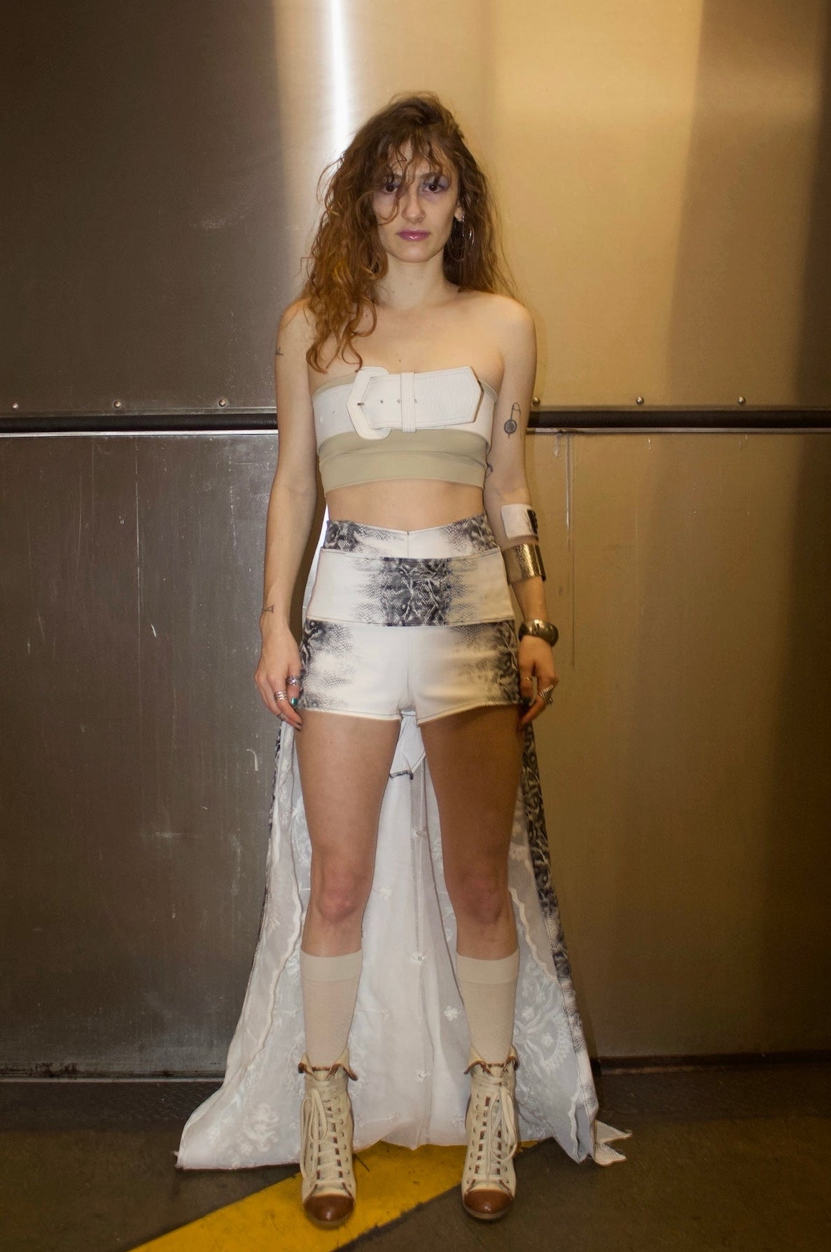 High waisted mini short with thick self belt, featuring a hook and eye closure Long train tail in the back, patterned into the bum, lined with lace. Fabric: Cotton Spandex blend Model wears: S